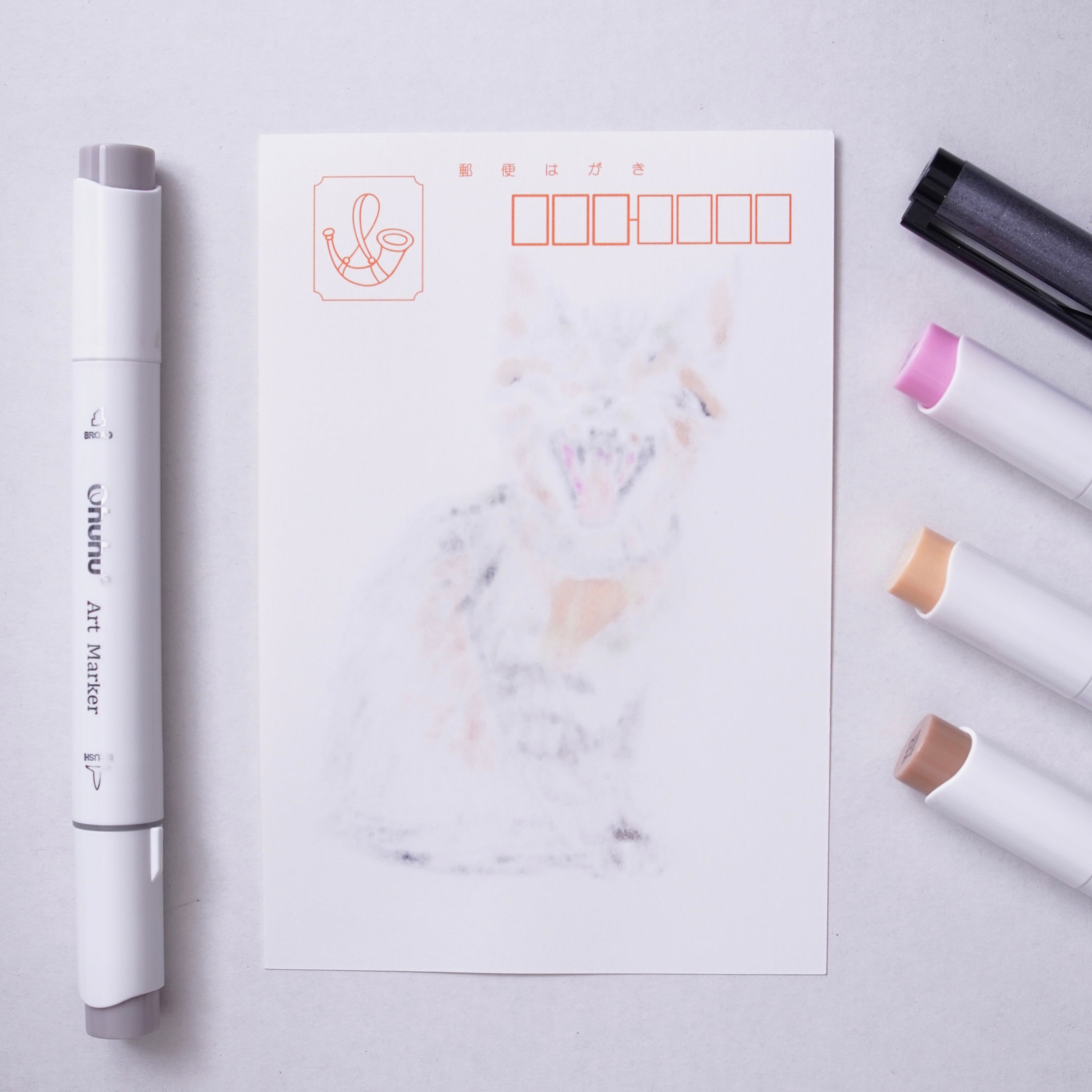 アルコールマーカー(Ohuhuマーカー)と色鉛筆を使用し、ケント紙の滑らかな質感を活かして丁寧に仕上げました。